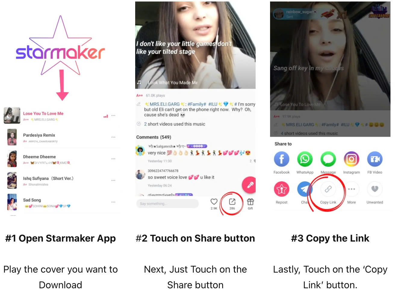 Open the Starmaker app and play any cover you want to download. Then, copy the URL of that cover and paste it into the box above.
